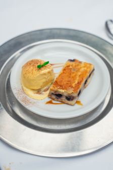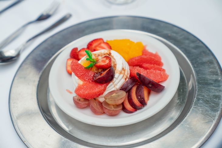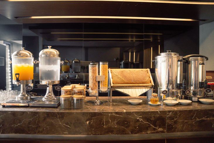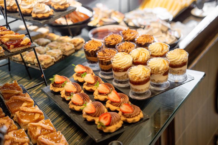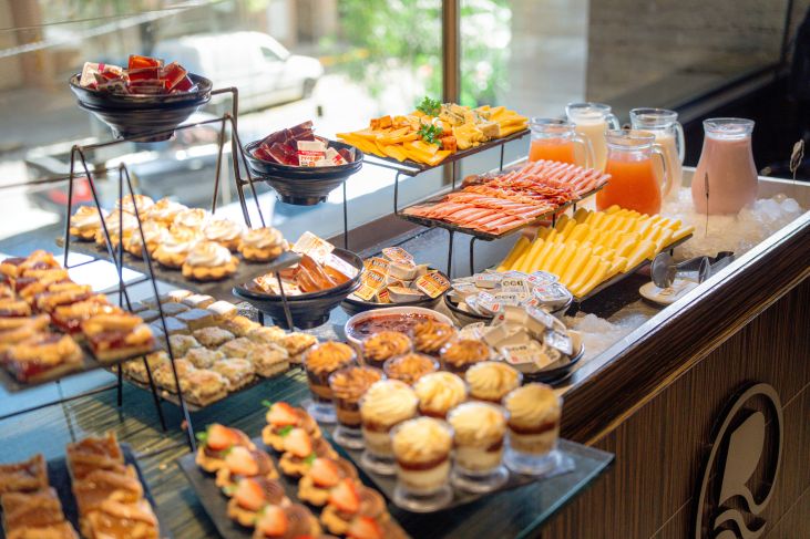 Medialunas dulces y saladas, cereales variados, panes blancos e integrales, quesos, mermeladas, frutas frescas de temporada, huevos revueltos, jamón y queso, además de una selección de deliciosos budines y tartas dulces de nuestra pastelería.